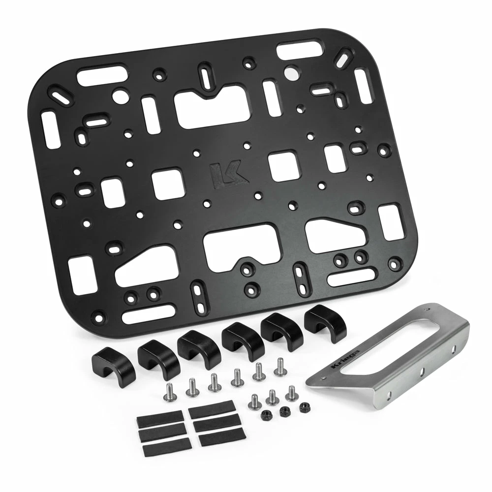 THE ADAPTOR is laser cut stainless steel which fixes to the OS-PLATFORM with 3 bolts and Nyloc nuts. It clamps to the top of the BMW frame using 2 of the aircraft grade aluminum clamps. The remaining 4 clamps fix the OS-PLATFORM directly to the frame, giving a very strong and stable base to add an OS-Pannier, OS-Adventure Packs or Rotopax™ fuel or water contains.