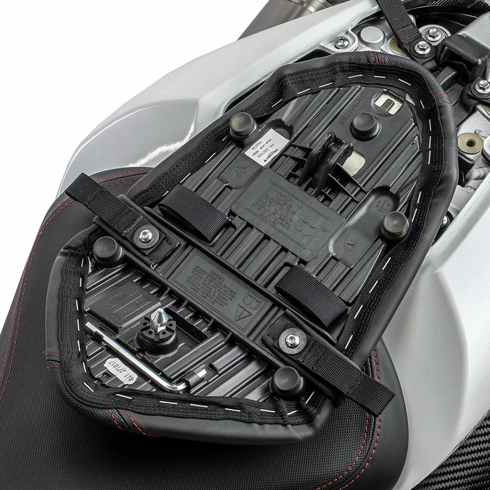 The kit consists of high quality hypalon & nylon webbing loops, that easily fit under the pillion seat using the existing mounting locations.